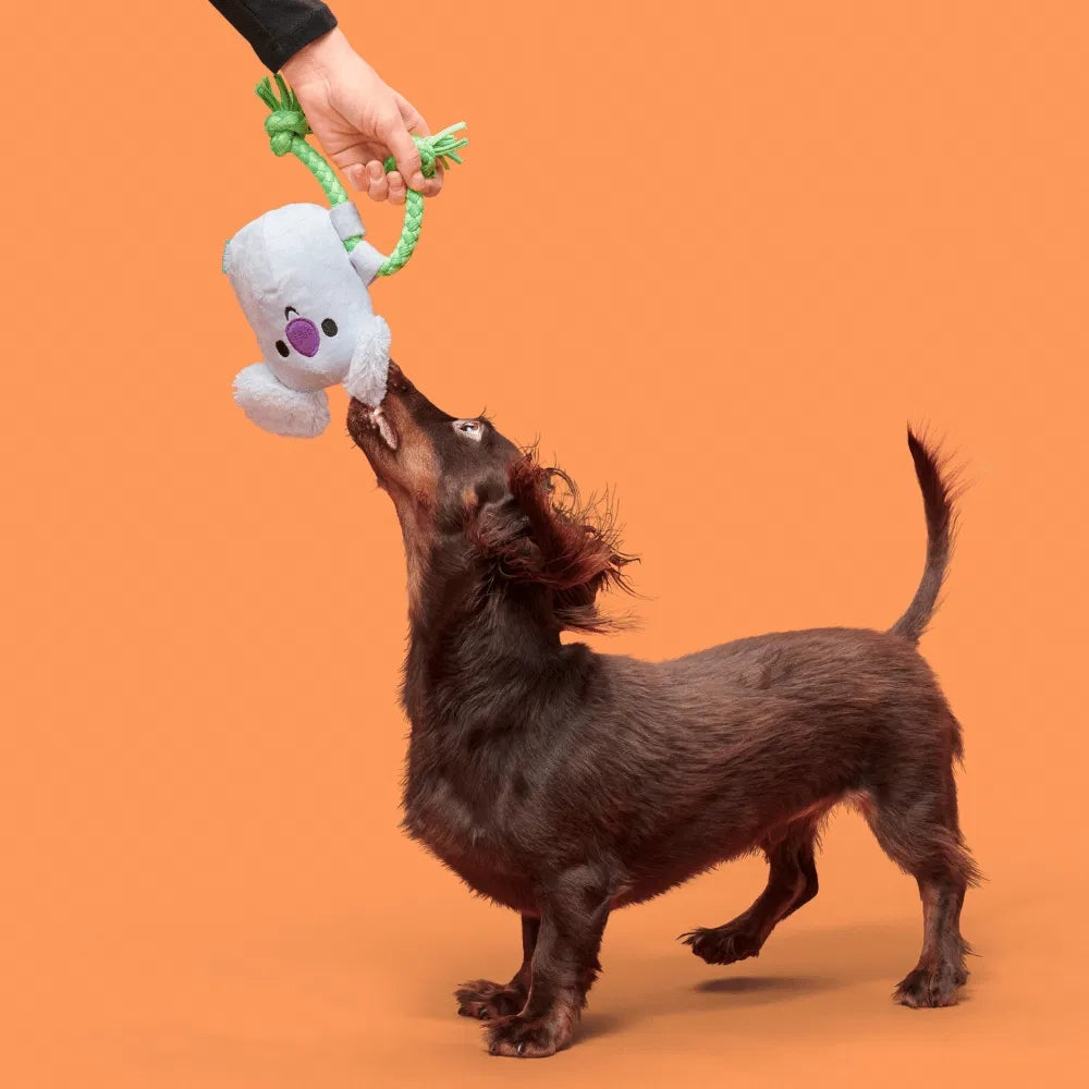 Take playtime to new heights with this koa-uddly koala dog toy! This cuddly climber is ready to rope your pup into some intense koa-limbing action just grab onto his t-shirt rope and hang on tight! Once you're up in the treetops, the fun continues with his squeaker, crazy crinkle, and long, shreddable fuzz. Whether it's a tug, a toss, or a good chew session, this koala is ready for an epic forest adventcha, mate!