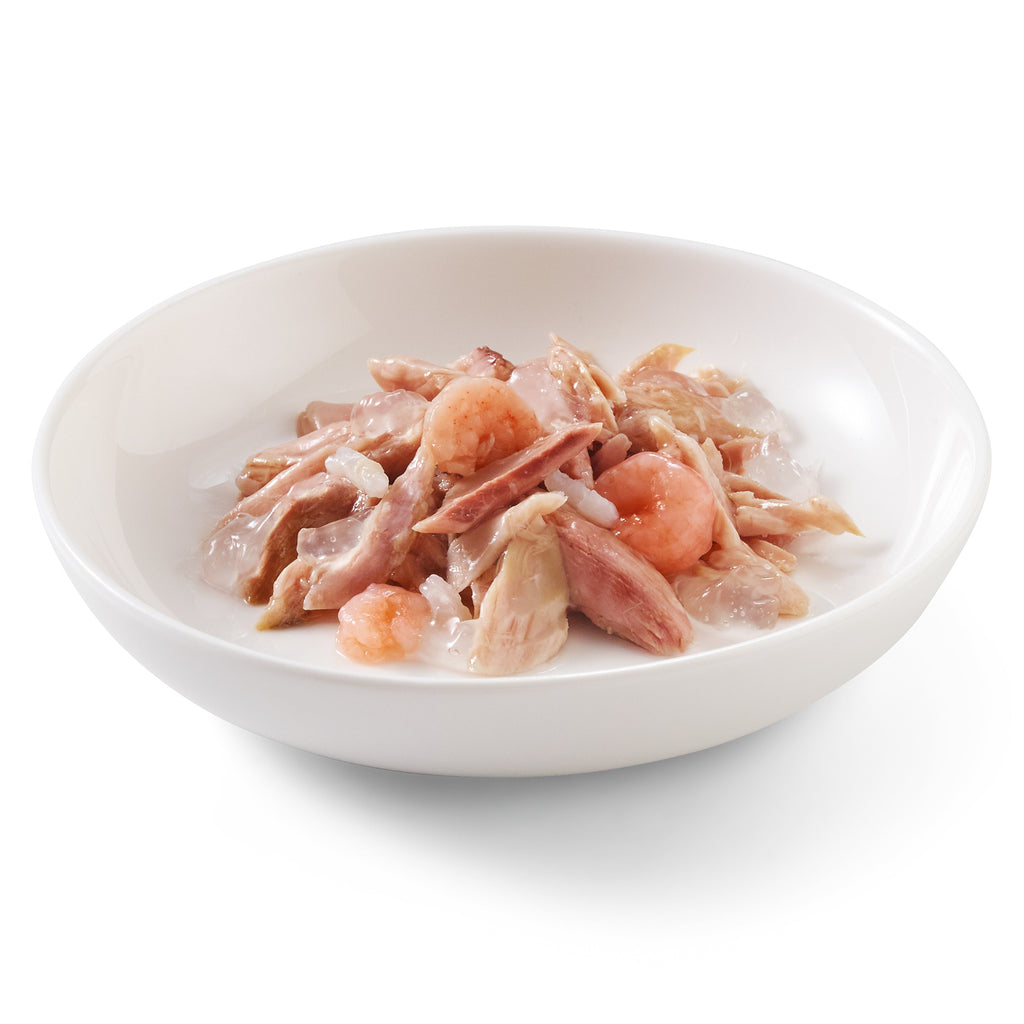 Real steamed tuna fillets with shrimps in jelly for a natural and irresistible mix.
